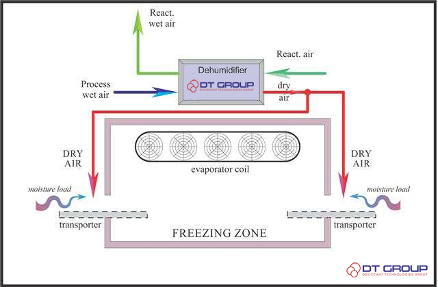 Our high-tech desiccant dehumidifiers create an ideal microclimate for frozen food production and storage by: