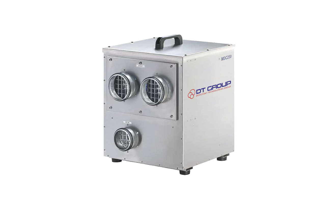 The MDC 250 desiccant dehumidifier is designed to efficiently dehumidify air in open system applications. The unit could operate in recirculation mode too. In this case plate with spigots for ductwork connection has to be ordered as additional accessory. The compact construction allows extended periods of operation with a minimum of maintenance. The design facilitates easy transport by one person. Dehumidifier is designed for drying-out buildings, new buildings as well as water damaged buildings. Furthermore, it is used for room air dehumidification, dry air storage, water works and pump stations, etc. Especially suitable for low temperature and low humidity operation.